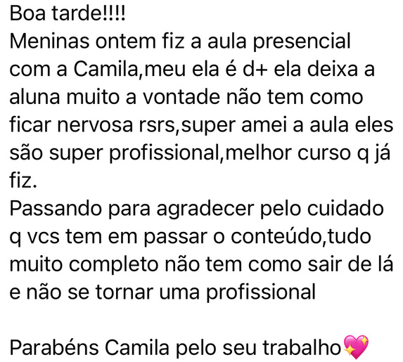 Você será inserida na nossa comunidade exclusiva, onde todas as nossas alunas, atraves de um grupo de whatsapp, compartilham dicas, informações, resultados dos procedimentos e principalmente incentivam umas as outras. A Mentora e Master Camilla Rocha vai lhe fornecer todo o suporte necessário para que você adquira confiança, habilidades e conhecimento para alcançar o sucesso no mercado atráves do seu canal direto de comunicação, te auxliando desde a compra dos seus materiais até mesmo durante um procedimento.